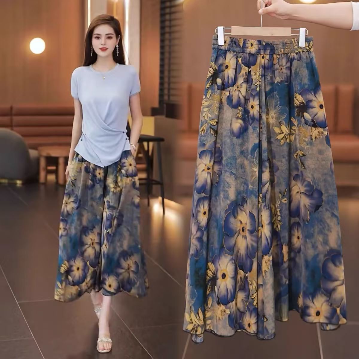 冰丝复古印花裙裤女2026夏季新款大码显瘦薄款宽松百搭阔腿休闲裤