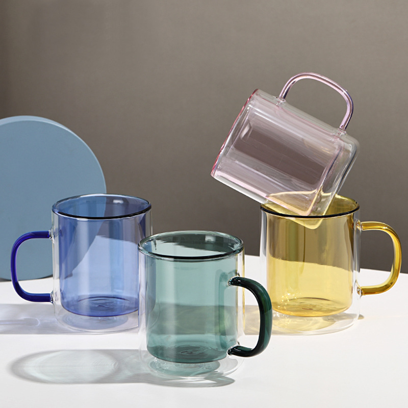 供应玻璃杯隔热透明玻璃咖啡杯高硼硅彩色双层玻璃杯带把双层杯
