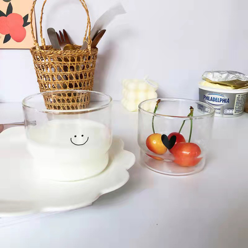 厂家ins风笑脸爱心早餐杯富士山高硼硅玻璃杯可爱笑脸牛奶布丁杯