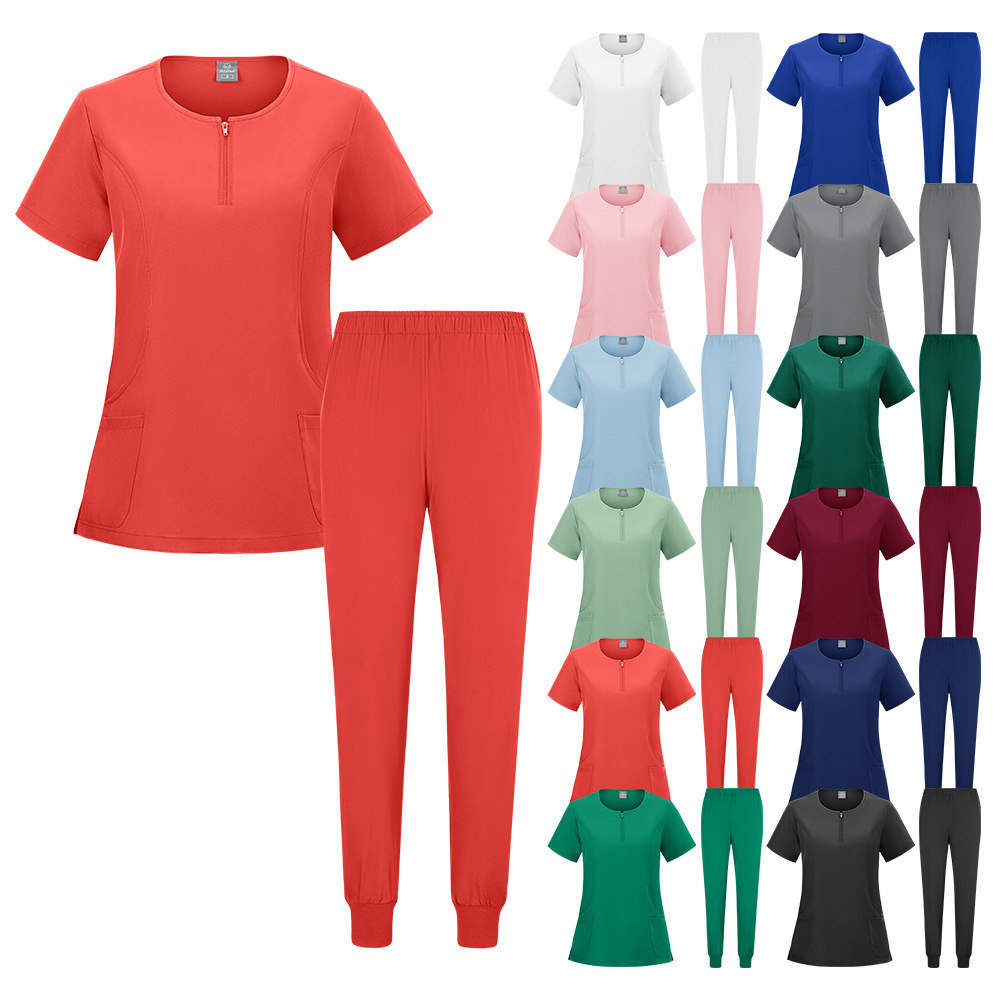 跨境新款圆领短袖洗手衣牙科医生隔离衣男女弹力速干拉链护士服