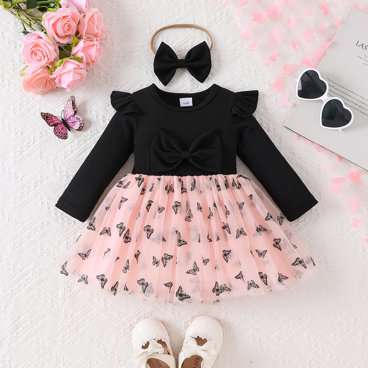 童装新款女童裙 黑粉色蝴蝶印花网纱裙 飞袖大蝴蝶结公主连衣裙