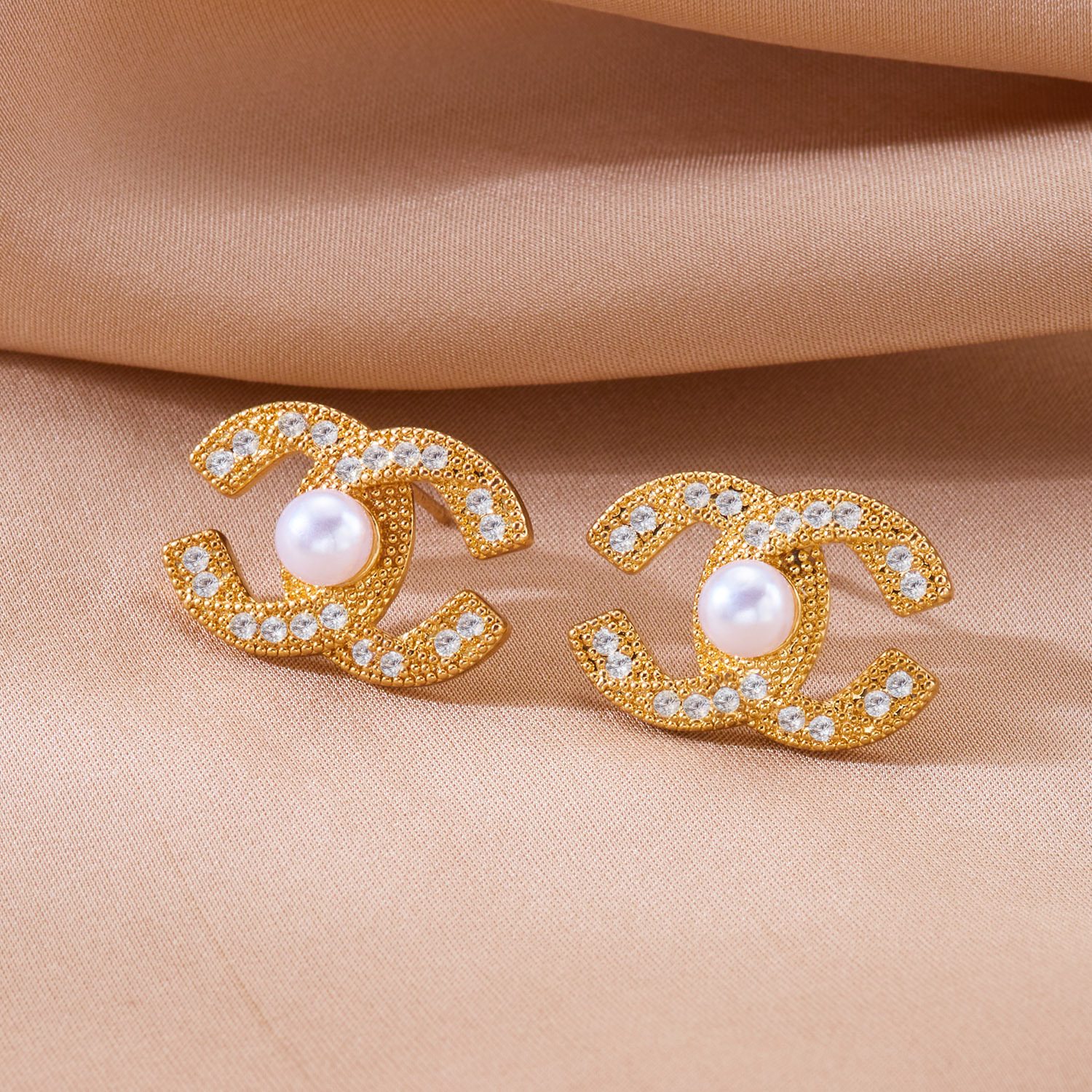 韩版东大门百搭铜镶锆双C珍珠耳钉女气质简约小香风耳环时尚耳饰