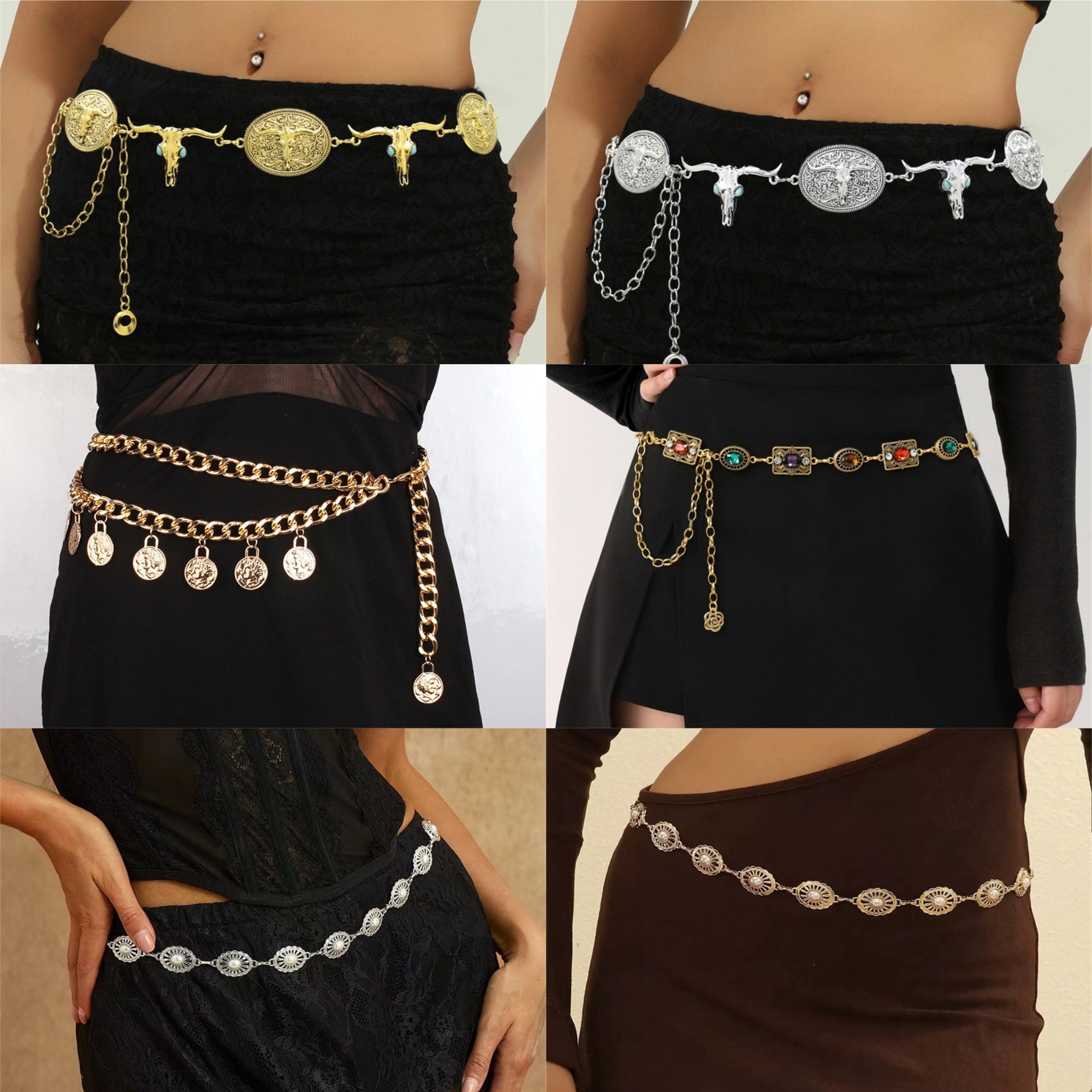 欧美跨境饰品复古金属牛头雕花吊坠流苏身体链女双层女王图像腰链