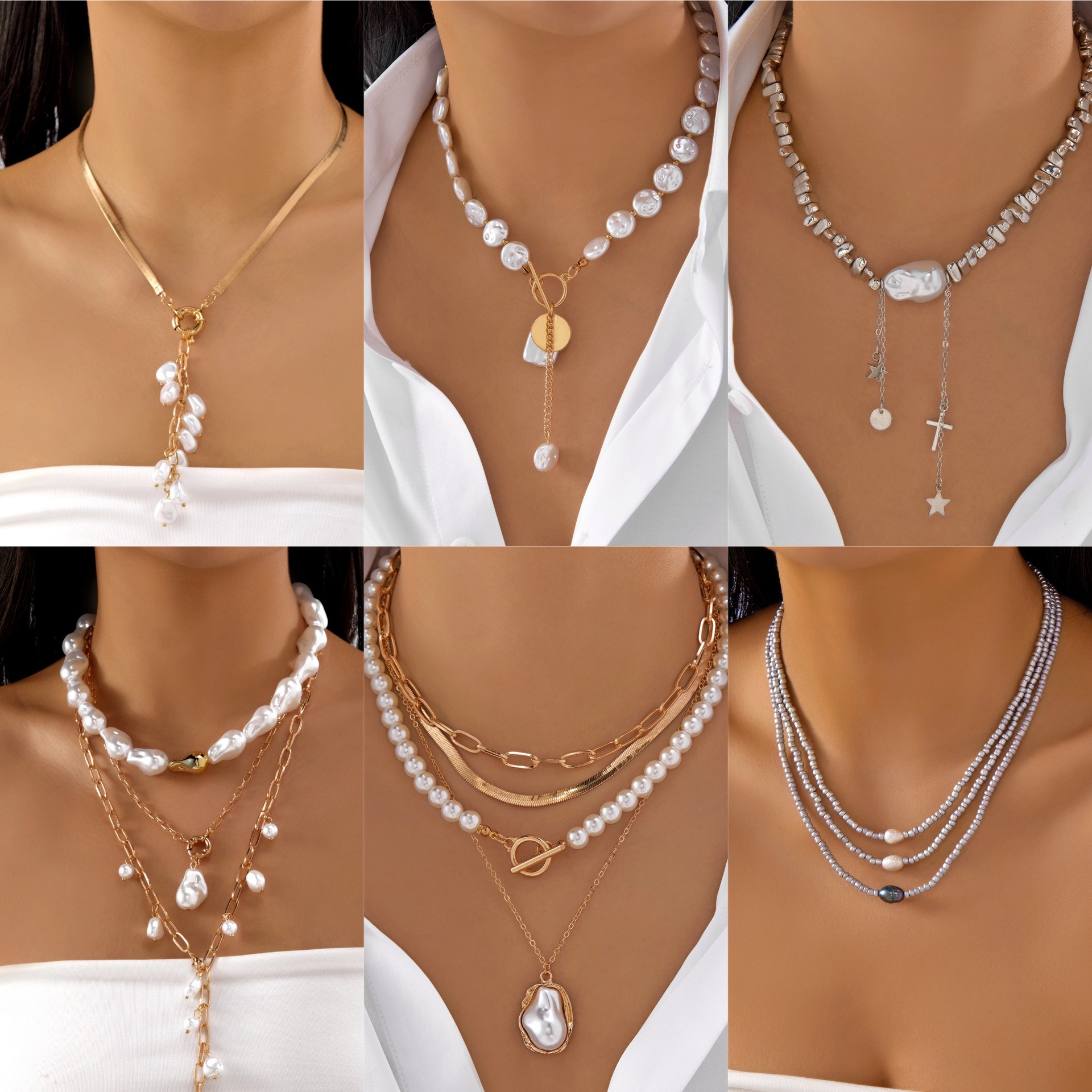 欧美跨境饰品巴洛克几何型仿珍珠串珠锁骨链复古时尚百搭项链套装