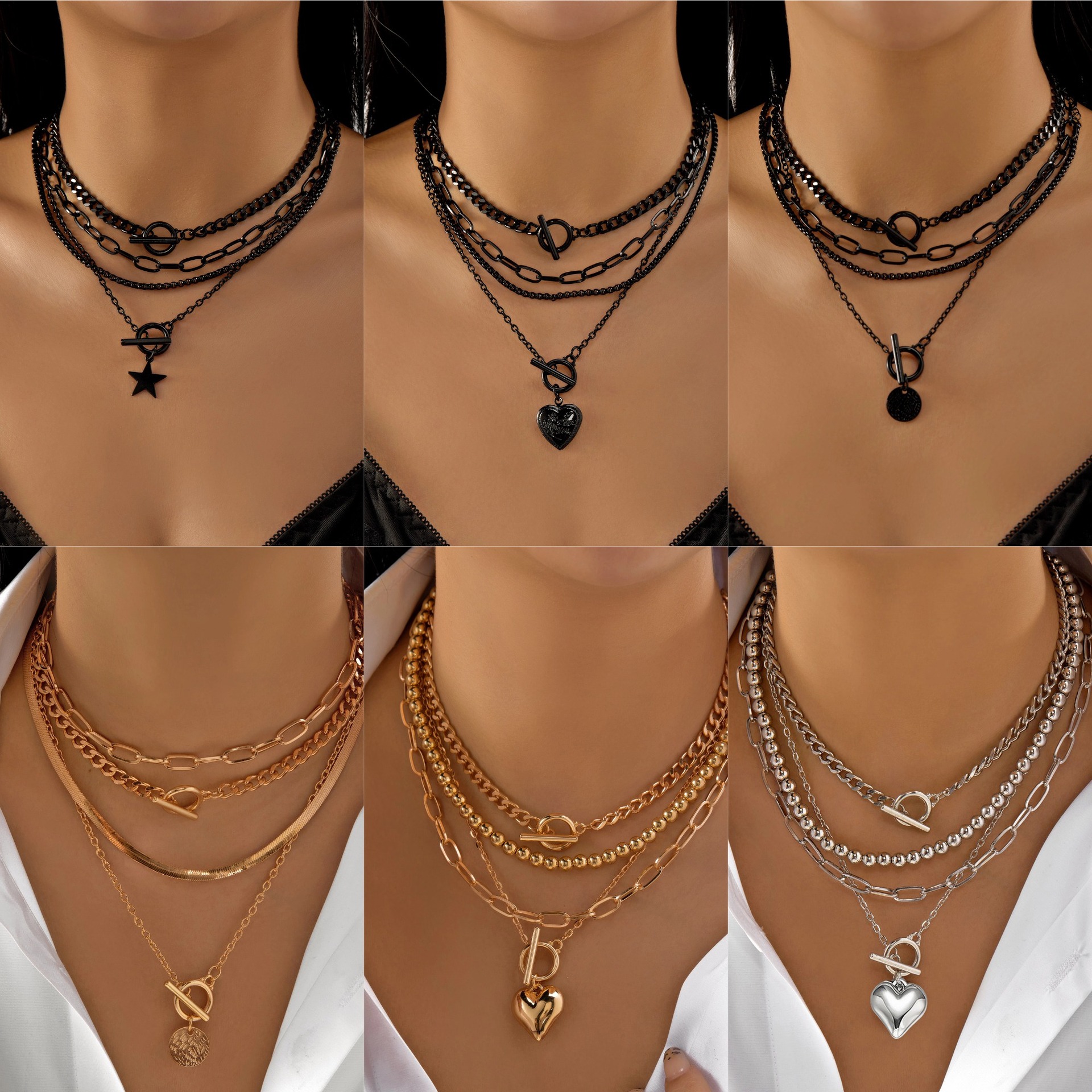 欧美跨境饰品暗黑朋克风爱心链条项链几何OT扣串珠圆片项链套装