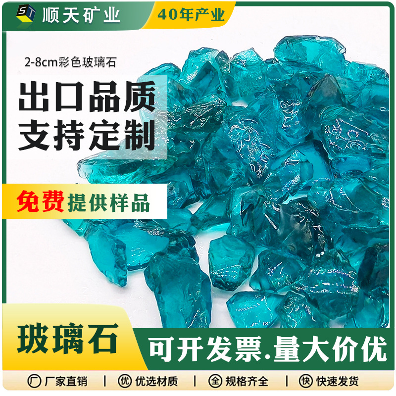 批发湖蓝玻璃石玻璃片园林造景石笼填充专用不规则彩色海玻璃厂家