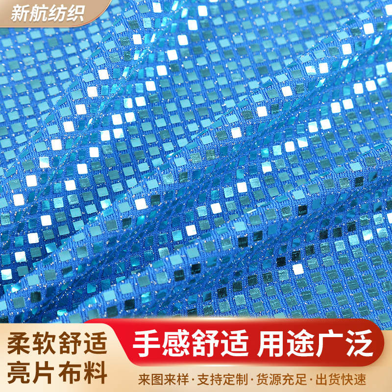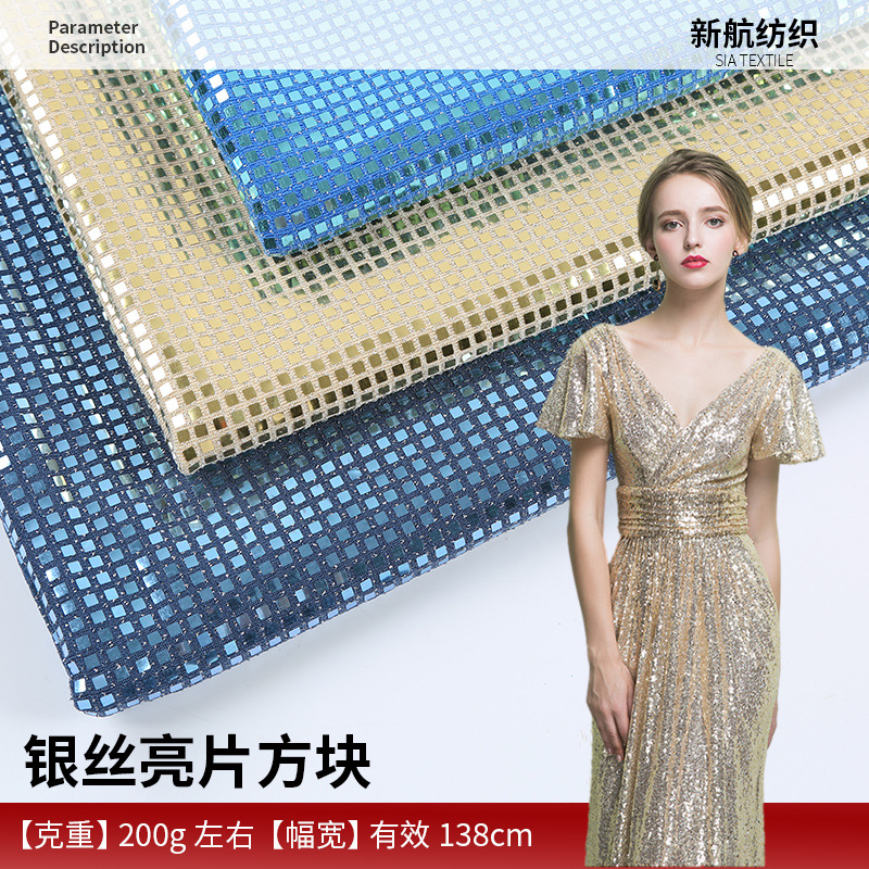 定制方块银丝亮片面料晚礼服女装面料厂家供应涤纶银丝冲片布料