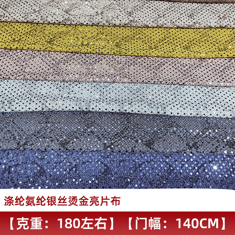 现货时尚礼服涤纶氨纶银丝烫金亮片布 柔软轻薄银丝烫金亮片面料
