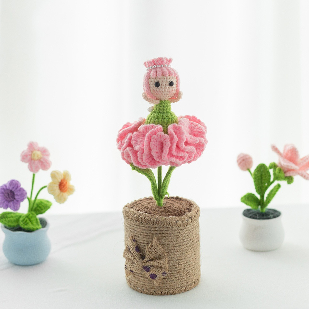 手工编织魔术式带底座康乃馨花仙子成品摆件假花钩织花朵居家装饰