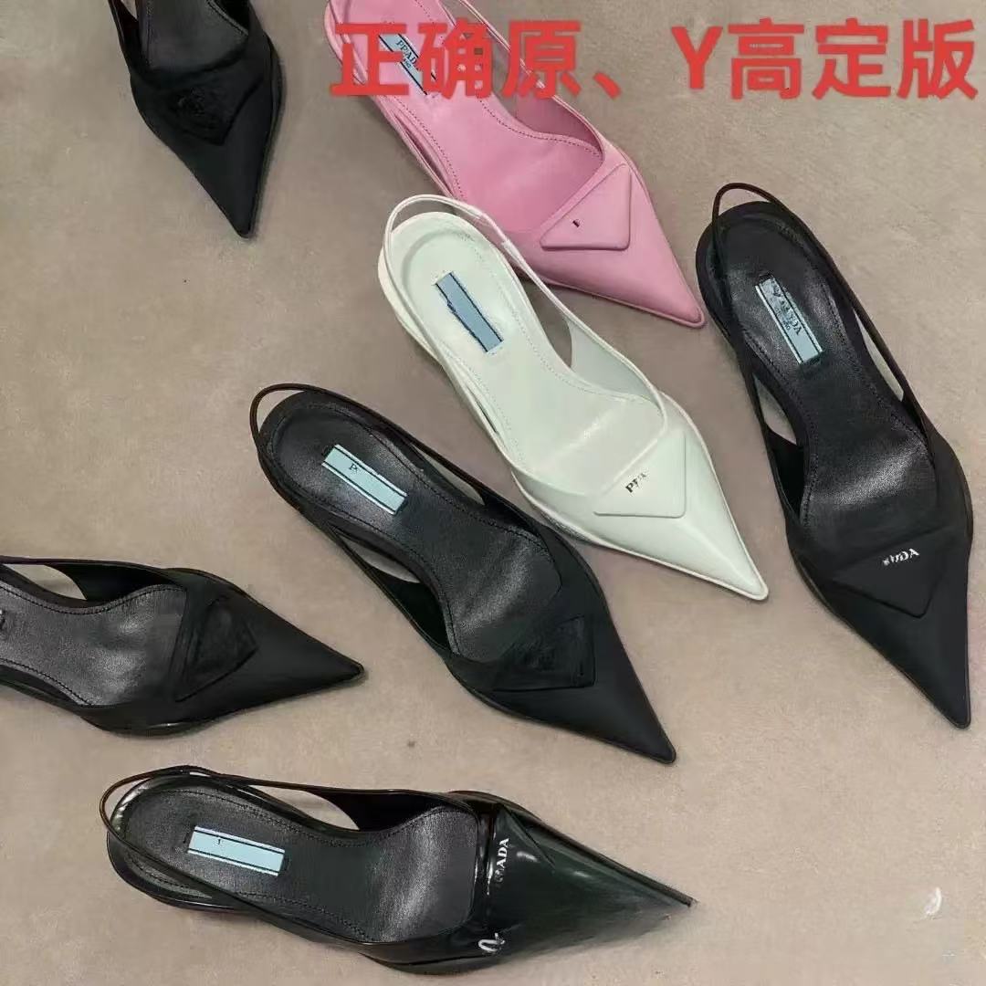 2025夏季P家三角标网红尖头猫跟凉鞋女包头浅口真皮后绊带高跟鞋